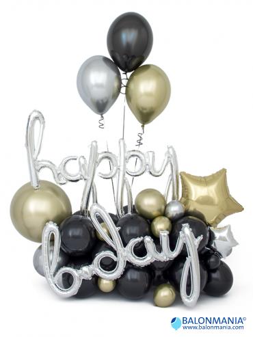 Dekoracija iz balonov na helij na temo ROJSTNI DAN je sestavljena iz: