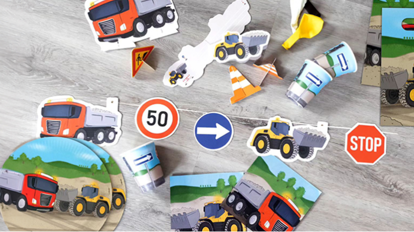 Vse, kar potrebujete za pravo gradbišče v dnevni sobi ali na vrtu, je tukaj: barvite dekoracije, baloni, figure in namizni dodatki s priljubljenimi gradbenimi vozili.